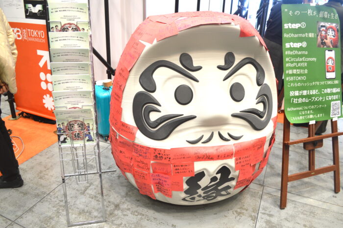 もうひとつは、三井化学のブース。なぜか大学生がチラシを配り、その傍に1mを超えるような巨大なだるまが展示されていたので、思わず立ち止まって話を聞くと、駒澤大学経営学部青木ゼミが、三井化学と連携したサステナブルなアクションをしているとのことでした。