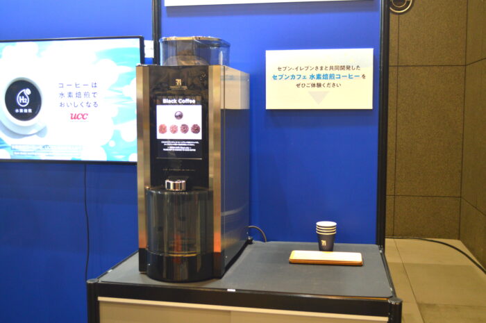 ひとつは、会場奥にあった「UCC Sustainable Cafe」。会場内でちょっと休憩できる場所を探していたら、コンビニ等で見慣れたコーヒーメーカーと、スタンディングで飲めるスペースを発見。実はこれ、現在セブンイレブン店舗で実働している「水素焙煎コーヒー」でした。