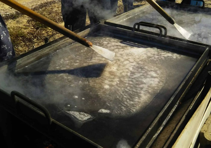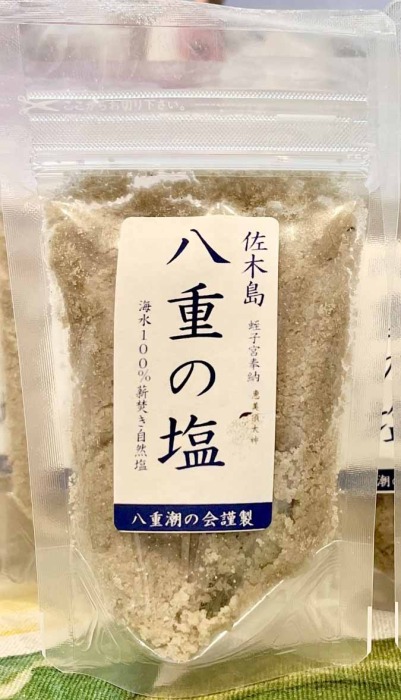 佐木島の海岸で汲んだ海水を、特注の鉄板で焚き上げて作った塩。ミネラル分を多く含んでおり、薄いグレーの色味と、凝縮された旨味が特徴。数回に渡って焚き上げるため、その度に微妙に味や色が変化する。海水の状態や鉄板の温度により、見た目も白っぽかったり、粒が大きくなったりと多様な仕上がりに。