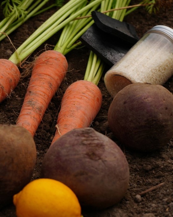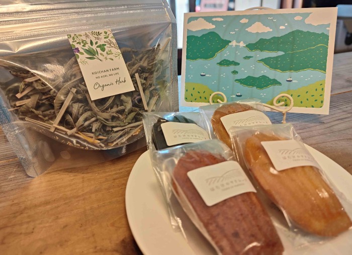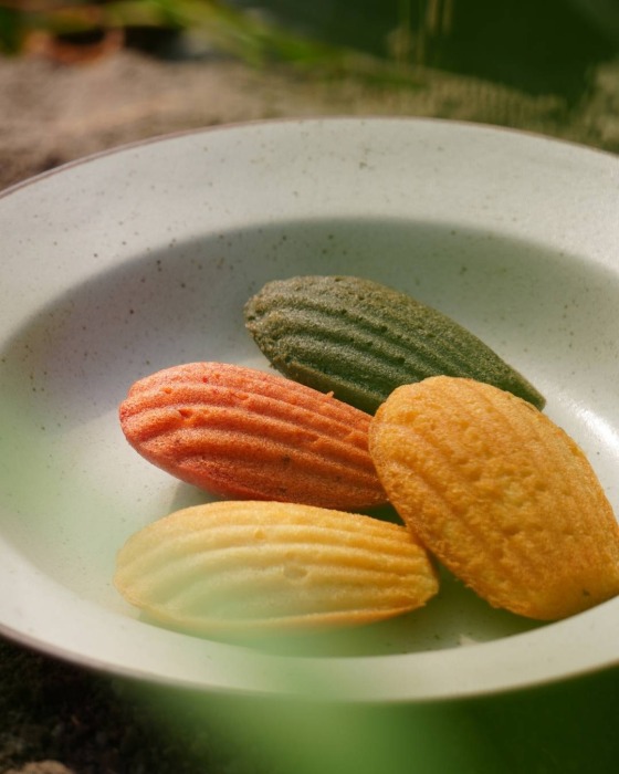 瀬戸内の野菜・果物と広島産の米粉を使った、小麦、卵、乳製品不使用の、からだにやさしいマドレーヌ。豆乳、豆乳バターのほか、甘味には甜菜糖やメイプルシロップを使っている。味はプレーン、人参、ほうじ茶、竹炭、レモン、ビーツの6種類。人参は02のしもみん農園の恋人参、ほうじ茶は上記のTeto tetoのほうじ茶を使用。