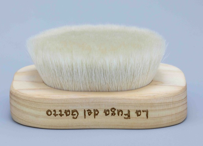 天然の山羊毛と人工毛をミックスした、毛量たっぷりの猫用のブラシ。お化粧にも使えそうなフワフワの毛先が特徴で、持ち手にはヒノキを使用。猫を膝に乗せて、毛筋に沿って優しくブラッシングしてあげよう。日本一の筆の産地である広島県熊野町で、高品質な化粧筆のあり方を追求してきた晃祐堂。極上の肌触りを実現するため、毛先をカットしない製法にこだわっている。