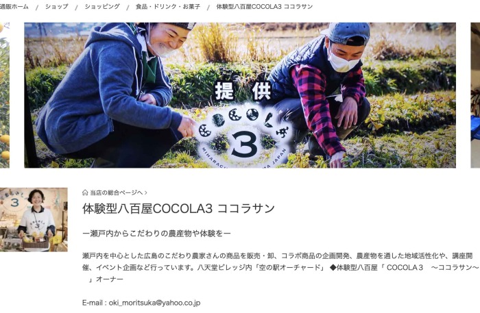 「COCOLA3」ネットショップでは、野菜や果物、加工品など、森塚さんがセレクトした瀬戸内を中心とした広島の商品を扱う。季節により商品ラインナップが変わり、旬を楽しめるのも魅力。P10、11で紹介した商品のほか、季節の新鮮なオーガニック野菜や果物を箱いっぱいに詰めたセットなども販売する。